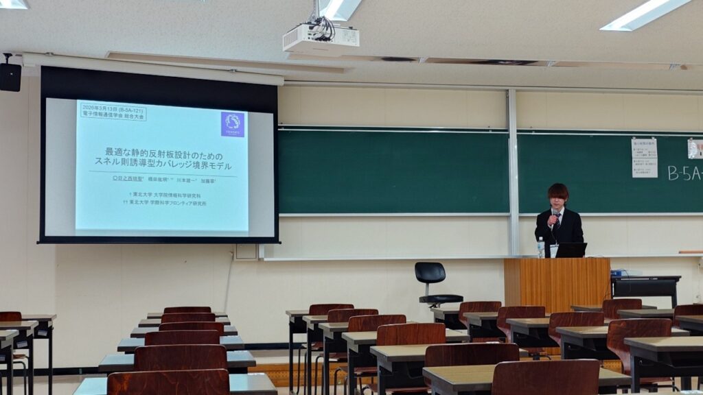 2026年3月に東京都葛飾区で開催されたRCS研究会において、日之西(M1)が「静的反射板のためのスネル則誘導型カバレッジ推定モデル」について発表を行いました。 -