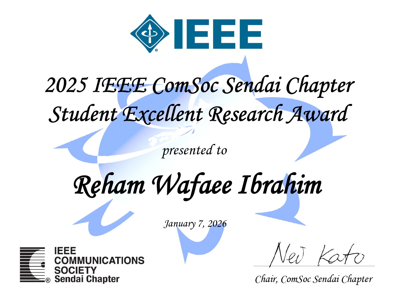 2025 IEEE ComSoc Sendai Chapter Student Excellent Research Award Published 2026-02-05 Author kwmt-admin カテゴリ 受賞 IEEE ComSoc Sendai Chapter 2025 IEEE ComSoc Sendai Chapter Student Excellent Research Award Reham Wafaee Ibrahim "Latency-Aware Task Offloading in Multi-Tier SAGIN With FSO-Enabled Mobile Edge Computing" Jan. 07, 2026
