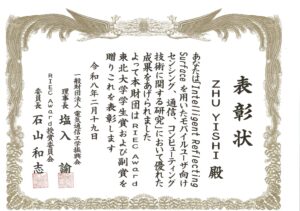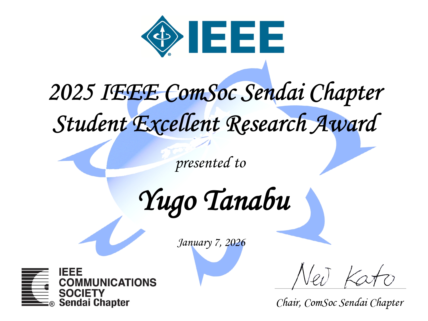 2025 IEEE ComSoc Sendai Chapter Student Excellent Research Award Published 2026-02-05 Author kwmt-admin カテゴリ 受賞 IEEE ComSoc Sendai Chapter 2025 IEEE ComSoc Sendai Chapter Student Excellent Research Award Yugo Tanabu "Environment-aware Beam Selection for Efficient Codebook Design in IRS-assisted Communications" Jan. 07, 2026
