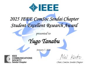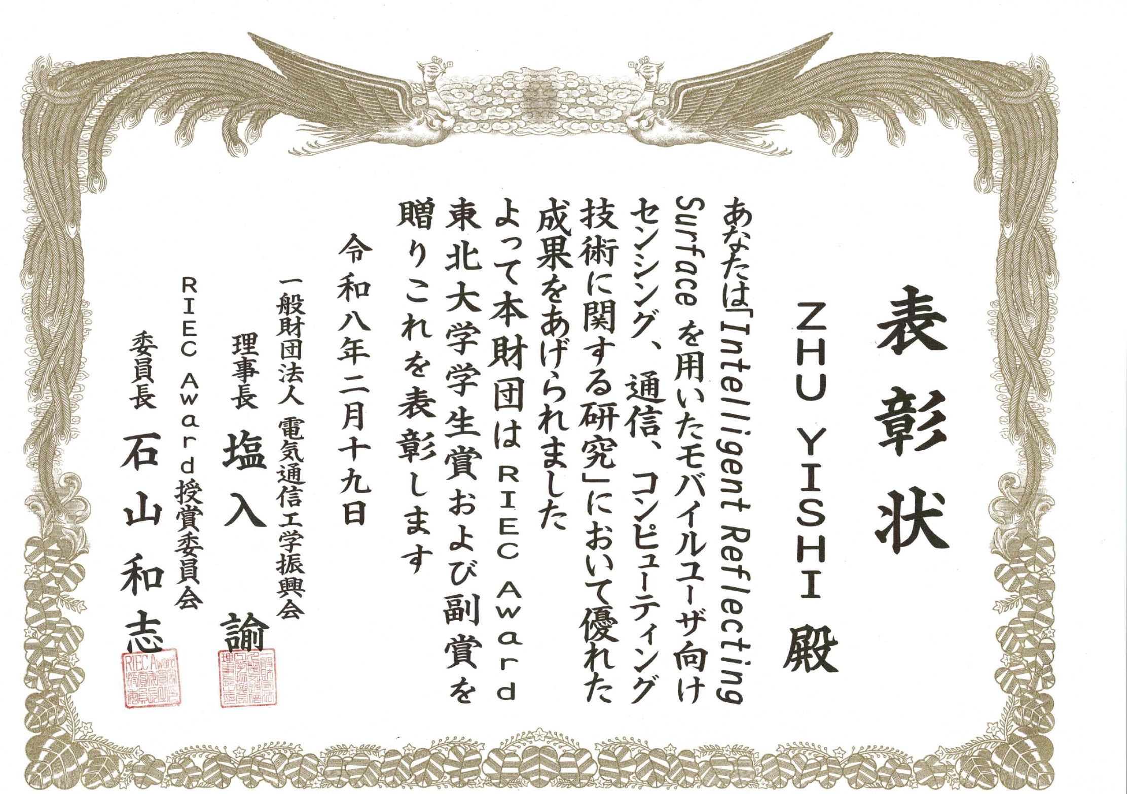 RIEC Award 東北大学学生賞 Published 2026-02-22 Author kwmt-admin カテゴリ 受賞 一般財団法人 電気通信工学振興会 RIEC Tohoku University Student Award Zhu Yishi "Intelligent Reflecting Surfaceを用いたモバイルユーザ向けセンシング、通信、コンピューティング技術に関する研究" Feb. 19, 2026